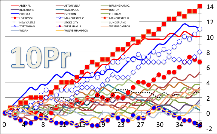29節(100505): 熾烈な4位争いの積み残し直接対決でトットナム勝利。 37節(100503): 最終節を残すのみですが、首位チェルシーに続くマンUも勝ち点差1、UEFACL(予選)出場権争いの4位トットナムに続くマンCも勝ち点差1。 36節(100425): チェルシーの首の差首位続く。Top3はチェルシー、マンUとアーセナル、降格3はポーツマス、バーンリーにハルCで決定か。4位争いは熾烈。 33節(100404): ポーツマスの処分を反映しました。チェルシー首位奪回。 32節(100329): マンUが5連勝で首位固め。 31節(100321): マンUに続いてアーセナルもチェルシーを抜く。プレミアリーグの決定により、経営破綻したポーツマスは勝ち点9剥奪。 30節(100315): 三強は団子状態。暗黒流れ星の逆バージョン。 29節(100308): 5試合のみ消化。とりあえず首位争い関係ではチェルシーが未消化で暫定ドロー扱い。他方マンUとアーセナルはガッツを見せてマンU奪首。チェルシーの試合数が1つ少ないのであくまでも暫定ですが。 28節(100228): 首位チェルシーは依然停滞で遂に2位アーセナル・マンUが1G差までに迫りましたよ。アストンV・ハルC戦は未消化のため暫定ドロー扱いにしてあります。 27節(100221): 2位マンU敗北で一歩後退。首位チェルシーに連敗がない中では苦しいですね。4位争いは熾烈。 26節(100210): 首位チェルシー敗北、3位アーセナル勝利でゲーム差を2に戻す。下のほうではポーツマスの降格は半分くらい確定ですが、他にボルトン、ハルC、バーンリー、ウォルヴァーとウェストハムが熾烈な争いを展開。リバプールとマンCの4位争いも面白そう。 25節(100207): アーセナルは首位チェルシーに敗北。結果的に連敗。 24節(100131): マンUが直接対決でアーセナルを倒して2位浮上。 21節(100112): 年末年始は変則日程や天候不順乱発でもはや未消化試合の山。列挙はしませんが全て暫定的にドロー扱いにしてあります。そんななかマンC好調4連勝で先頭集団に食らいつきつつあり。 18節(091221): 首位チェルシー停滞も2位マンUおつきあい。3位アーセナルが追いついてきましたよ。 17節(091216): バーミンガムCは5連勝で上段に食いつく。 16節(091213): バーミンガムCがこっそり4連勝で中段首位に。 15節(091207): チェルシー敗北、マンU勝利で次節にも逆転の可能性。 14節(091129): チェルシーが5連勝でプチ独走中。今季これまでのところ優勝争いの常連に加えてワイルドカード的に絡んできているのはバーミンガムですね。マンCは7戦連続ドローというよくわからない展開。 13節(091122): 掲載開始。今季昇格してきたのはバーミンガム、バーンリーとウォルヴァーハンプトン。