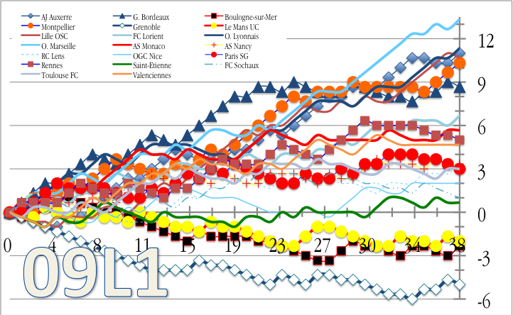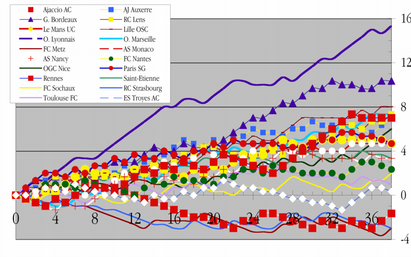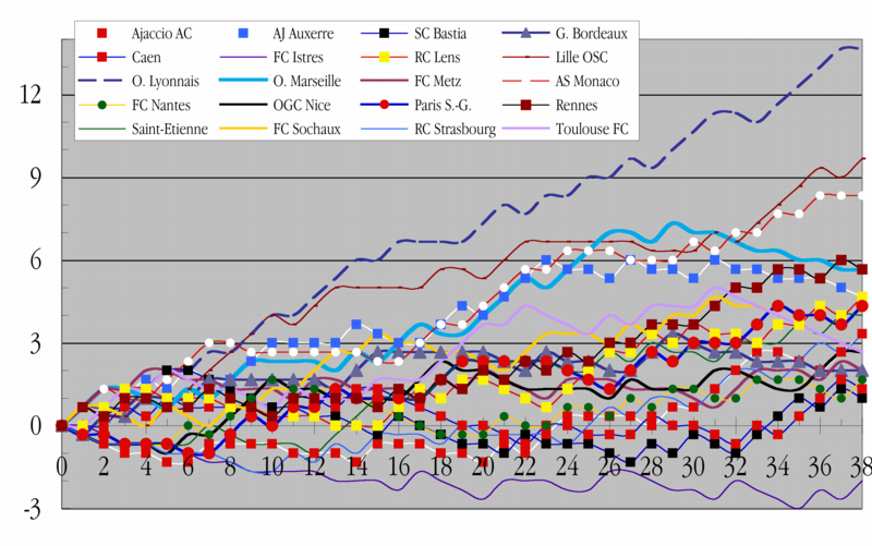 38節(090530): マツーイのサンテチは首皮一枚で残留。 37節(090523): 最終節1試合を残すだけとなったが首位争いは1G差(勝ち点差3)。あとは得失点差などの話もあってややこしいので保留。 36節(090517): 首位争いは相変わらずボルドーとマルセイユ。残り2戦。マツーイのサンテチは降格争いのまっただ中。 34節(090503): 首位争いはマルセイユとボルドーに絞られましたね。おまけに首位マルセイユがドローでボルドーに並ばれた! 31節(090412): 首位争いはやはり依然混沌もさすがに5-6位のリールとトゥルーズはもう届かないだろうと見るべきか。 30節(090405): 首位争いは依然混沌。 26節(090301): シーズン中盤を過ぎてリヨン、パリSG、ボルドーおよびマルセイユが首位争いというのは、このグラフ掲載開始以来、もっとも盛り上がっているシーズンですね。マツーイのサンテチは古巣ルマンに肉薄。 25節(090222): リヨン首位固め再点火。 23節(090208): 最下位ル・アーブルが10戦振りの勝利。しかも首位争い中のレンヌから。関連して、先頭集団が2つに分かれつつあるような気がします。 22節(090201): 先頭集団がはっきりしてきましたね。ル・アーブルの最下位も。マツーイのサンテチは今季は降格を逃れるのが精一杯ですか 21節(090118): 逃げるボルドー 20節(090111): ルマン、リール、ナンシーとニースは未消化のため暫定的にドロー扱いにしてあります。が、首位争いをしているボルドーとリヨンは完全消化です。 19節(081221): マツーイのサンテチはさらに順位を上げて行きます。 17節(081207): マツーイのサンテチはさっそく連勝。上の方ではリヨンが停滞? 16節(081130): マツーイのサンテチは監督交代でさっそく7連敗を止めました。ついでに最下位脱出。まあ今季は降格争いに勝ち抜くことですね。ニース・グルノーブル戦だけは12月10日実施予定で未消化なので暫定的にドロー扱いにしてあります。 15節(081123): 名門パリSG復活か?3連勝で3位浮上です。 08節(081017): 掲載開始。今季昇格してきたのはルアーブル、ナントと日本の通信系企業インデックスが出資している(はずの)グルノーブルです。ちなみにグルノーブルには伊藤翔も所属。マツーイのサンテチは中段下位に沈んでいますが、古巣のルマンは好調ですね。