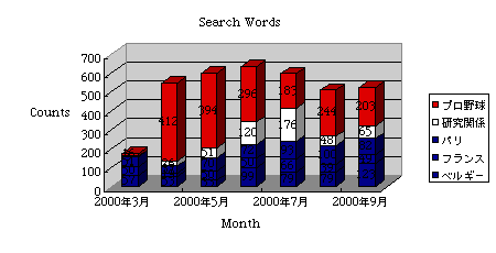 トータルのページ・ビュー(=のべ来訪者数)のうち、どの部門に人気があるかの変動。シーズン当初はプロ野球関係のページが置いてあるモetcモに集中したが、学期末の7月と1月の試験シーズンには研究関係のモetudeモに大きなアクセスが。ヨーロッパ事情関係のモeuroモはコンスタントな人気。下の検索語についても同じことが言える。