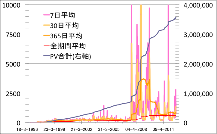 率直に言って、2007年9月から2009年12月がピークでした。あくまでも皮膚感覚的なものですが、SNSの台頭で持っていかれた気がします。ブログ時代の影響というのもありそうなのですが、どうもブログの絶頂期というのが何年ごろで、一般の個人サイトへの影響がどのようなものであったのか、わからないですね。ただし、2010年以降も、2007年以前以上のアクセスのペースが続いていることは確かです。