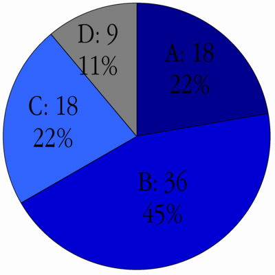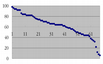 図はあくまでも素点の分布である。期末試験受験者68名、60点以上42名(61%)。あくまでも素点の分布であるが、A/B/C/Dの分散も順当と思われる。が、約束通り、最終評語の決定には講義時間内に実施した Minute paper の成績による加算を実施する。これで私の2年間のK非常勤も終わりです(の筈)。ありがとうございました。履修登録108名、期末試験受験者81名。うち、評点の分布は左図の通り。評語の隣にある数字は実数である。