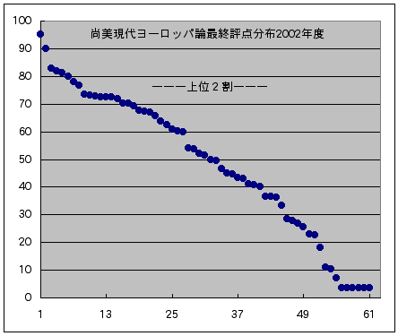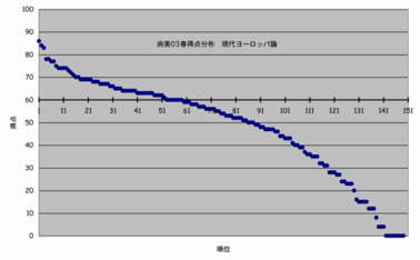 試験のみを含む1回以上の出席者(評価対象)15名、平均点は70。評価では、90点以上の「秀」3名(20%)、80点以上の「優」3名(20%)、70点以上の「良」2名(13%)、60点以上の「可」3名(20%)で単位取得者は11名(73.3%)。(カッコ内は評価対象者に占める割合)。少人数であったためか、単位取得率は極めて高くなっています。出席、中間、期末を通じて満点が一名います。石橋君、おめでとう。今後この科目に挑戦する方はわからないことは石橋君に聞いてみるのもいいかも知れません。あれ?石橋君は現代ヨーロッパ論も「秀」ですな。