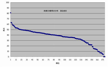 受講登録者数84名、受験者数61名、満点30点で平均10点、最高27点。最優秀者は中村祐子さん27点でした。おめでとう。「勉強してなくても怒らないから、正直に普段と試験前あわせて何時間勉強したか書いてみてください」として調査した結果、申告者の平均は1時間でした。まあ、これでは少ないわな。勉強の仕方がわからないのかも知れないですから、その方面の指導も必要かも知れないですね。そのせいか、設問中に「第二次世界大戦後、ドイツは南北に分断された」という文章の正誤を問うものがありましたが、この一般常識といえる設問でも、61名中21名がこの文章は正しいと答えました。よーく考えてみましょう。なお、試験終了後、pdfレジュメが閲覧できなかったというクレームがありましたが、大学PCエリアの共用PC(Windows98SE/Adobe Reader6.0)で確認したところ、特に問題はありませんでした。03年度春政治史Bおよび現代ヨーロッパ論共通(重要)