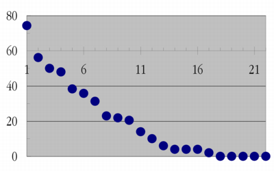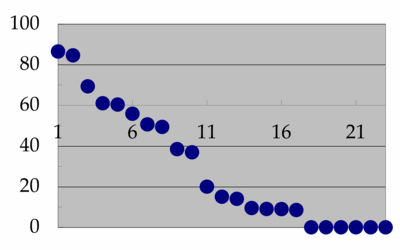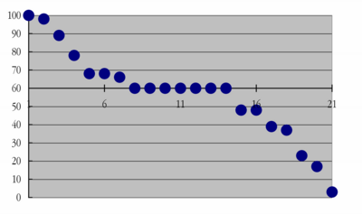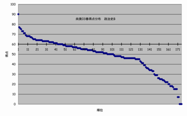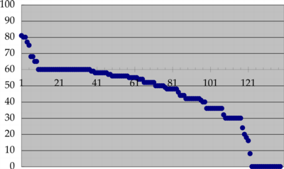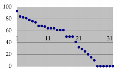 最終的な得点分布は下のグラフの通りとなっています。縦軸に試験成績、横軸に順位をとってあります。登録総数62名、試験のみを含む1回以上の出席者(評価対象)62名、平均点は48。評価では、90点以上の「秀」2名(3.2%)、80点以上の「優」4名(6.5%)、70点以上の「良」12名(19.4%)、60点以上の「可」9名(14.5%)で単位取得者の割合は27名(43.5%)。(カッコ内は評価対象者に占める割合)。出席回数が1回以下の履修放棄と見なされる人数は8名であるので、これを差し引いた実単位取得率は50%。中間試験を受けないで最終試験のみ来た者が13名、うち1名はそれまで1回も出席せずに期末試験だけ受験した人ですね。しかし中間試験未受験でもその他の出席状況や期末レポートが優秀であったために最終的に単位を取得した者が2名います。ちなみに、今回単位取得者の中で最も出席の少ないのは6回でした。落第者の中には残念ながら11回出席してくれた人も含まれています。このような落第がでたのは、期末レポートに不正が多く見られたためです。文献やWWWなどからの丸写しである「クロ」のレポートが確認しただけで8名ありました。この他、そのレポートが認められても最終成績が合格ラインに達しないため、厳密に検証しなかった「灰色」のレポートはさらに多数あります。教員は、毎日毎日関連文献を読み返しているのですから、丸写しはすぐにわかるので無駄な努力はやめたほうが賢明と思われます。ちなみに、丸写しはもちろんゼロ点です。本来はその上で不正行為としてなんらかのペナルティが課せられるべきものと思われますが、今回は見送っておきます。だいたいの引き写し元の見当は付いていても最終的に確定するために厳密な照合を行うので、教員の負担は大変大きく、また、採点作業の遅延により事務にご迷惑をおかけすることとなるので、学生諸君は態度を改めて下さい。