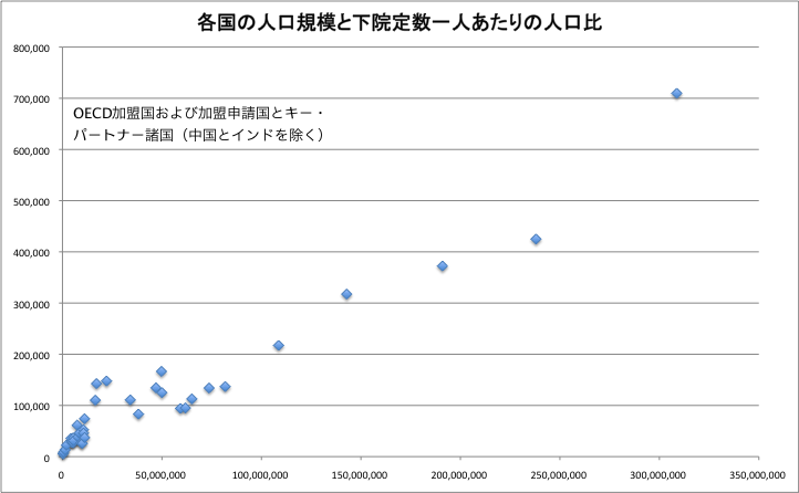 日本の議会について、議員定数削減の議論がある。アメリカに比べて多すぎるとか、ヨーロッパに比べて少なすぎる(あるいは適正である)などの意見が見られるが、そもそも、議員一人あたりの人口というのは、各国の人口規模によるところがあるのではないかと思っていた。どんなに国の人口規模が小さくとも、一定数の議員は必要になるだろうと考えられる一方で、その基準をそのまま人口数億の大国に当てはめれば途方も無い議員数となるだろうことも自明だからだ。